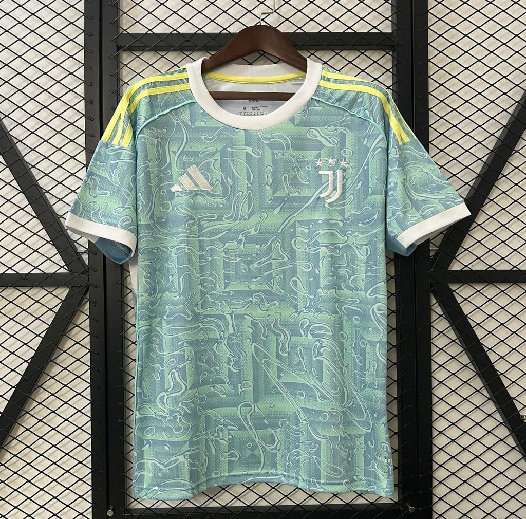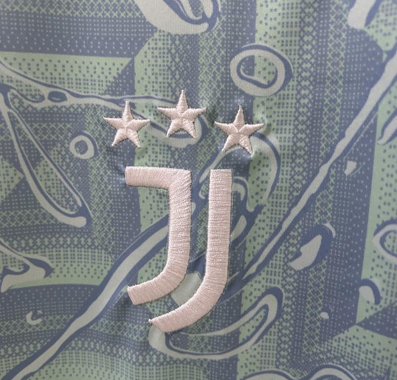 A gola redonda branca e os punhos brancos adicionam um toque limpo ao design ousado, enquanto o escudo da Juventus e o logo da Adidas aparecem em branco, harmonizando com o restante do uniforme. Ideal para torcedores que apreciam inovação sem perder a identidade do clube.