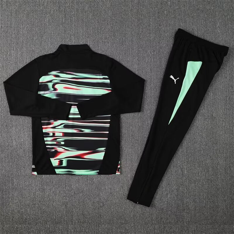 Demonstra o teu espírito desportivo com este Fato de Treino Portugal 25/26 Preto e Verde Unissexo, composto por casaco de manga comprida com fecho 1/4 e calça ajustada. O design arrojado, com riscas dinâmicas em tons de preto, verde e vermelho, dá-te um visual moderno e cheio de atitude.
