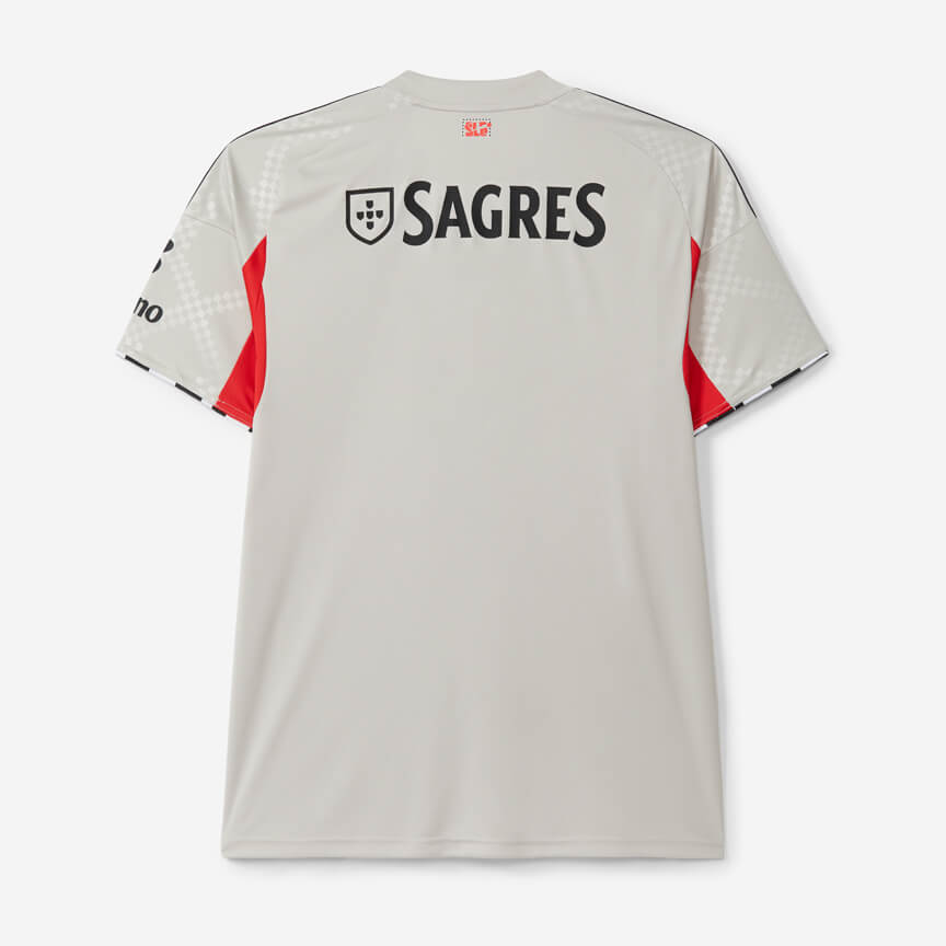 Nas costas da camisola alternativa SL Benfica 25/26, o destaque é o patrocínio da Sagres em destaque, reforçando a identidade do clube com classe. Ideal para uso em jogos, no dia a dia ou para colecionadores que procuram uma camisola de futebol diferente e estilosa.